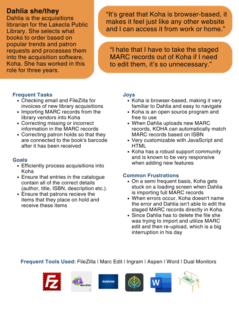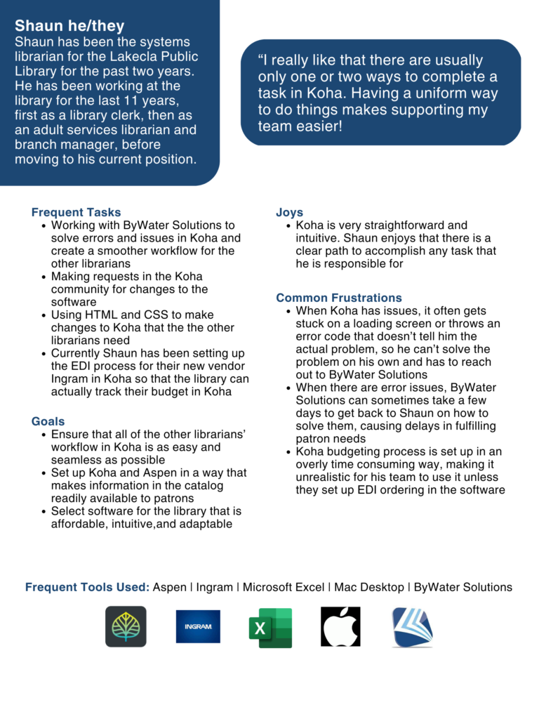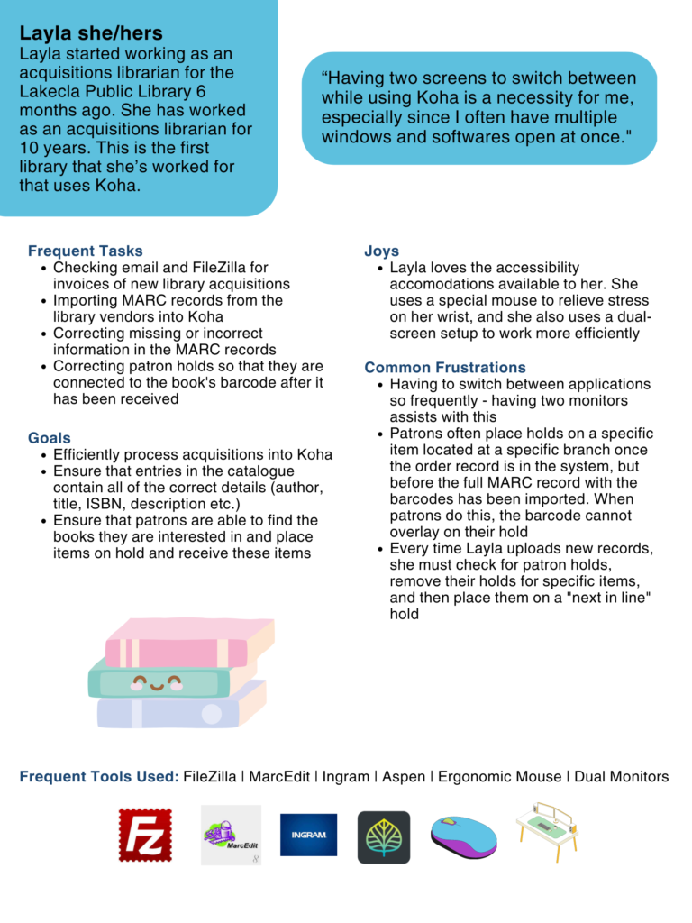 All of the empathy tools were created based on the data collected during the interviews and site observations of the librarians. A group interview was conducted with all three librarians to learn about their process and identify any joys or difficulties they had with Koha. Another research objective was to identify any accessibility measures used at the library. After the interviews, two of the librarians were observed going through their typical tasks to further understand how they use Koha firsthand. All of the research was recorded and referenced later to make the empathy tools.